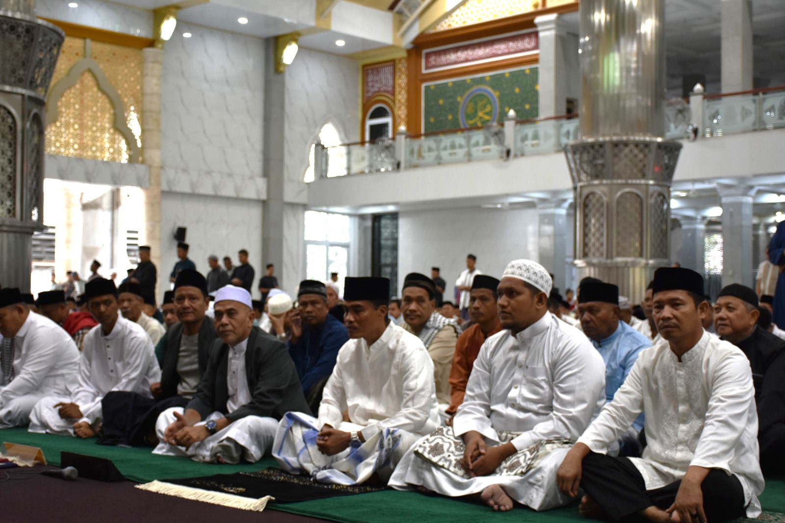 Kota Langsa - Pj. Walikota Langsa Syaridin S.Pd M.Pd dan Sekretaris Daerah Ir. Said Mahdum Majid Bersama Unsur Porkopimda, Pimpinan OPD, BUMN, Tokoh Agama, beserta Ratusan Masyarakat Kota Langsa melaksanakan Shalat Ied Idul Adha di Masjid Darul Fallah Kota, Senin (17/06/2024).