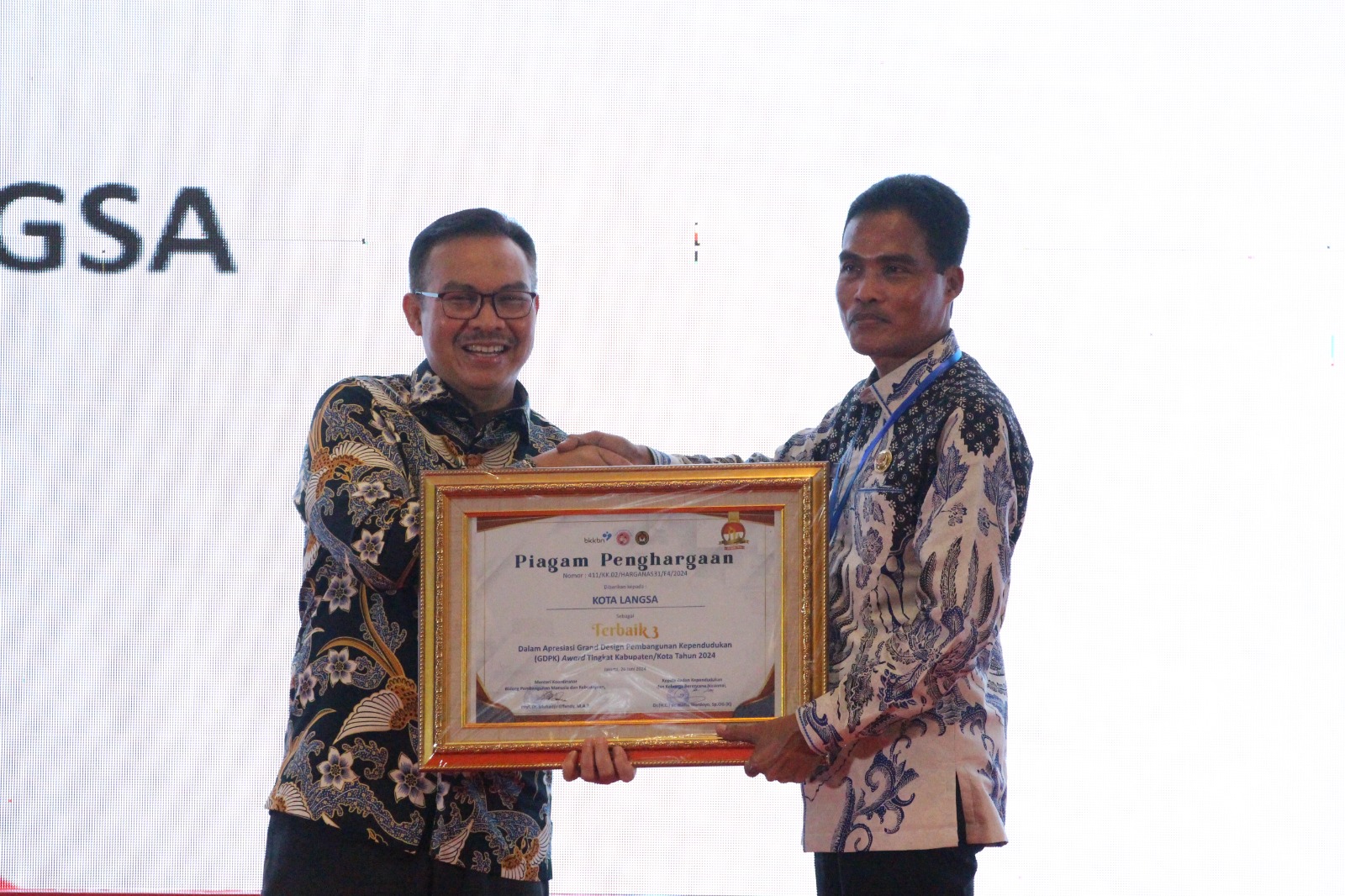Kota Langsa - Pemerintah kota Langsa meraih penghargaan Grand Design Pembangunan Kependudukan (GDPK) Award tahun 2024 peringkat III di tingkat nasional dari Badan Kependudukan dan Keluarga Berencana Nasional Republik Indonesia (BKKBN) RI.