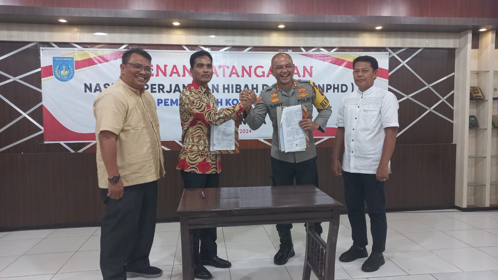 Penandatanganan NPHD dilaksanakan di Aula Setdakot Kota Langsa ditandatangani langsung oleh Pj. Walikota Langsa Syaridin dan Kapolres Langsa AKBP Andy Rahmansyah, Jum'at (17/5/2024).
