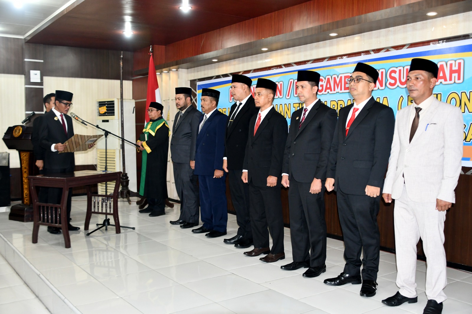 Kota Langsa - Penjabat (Pj) Walikota Langsa Syaridin, S.Pd., M.Pd Melantik dan Mengambil Sumpah 8 Pejabat Pratama (Eselon II) di lingkungan Pemko Langsa, Jum'at 14/06/24
