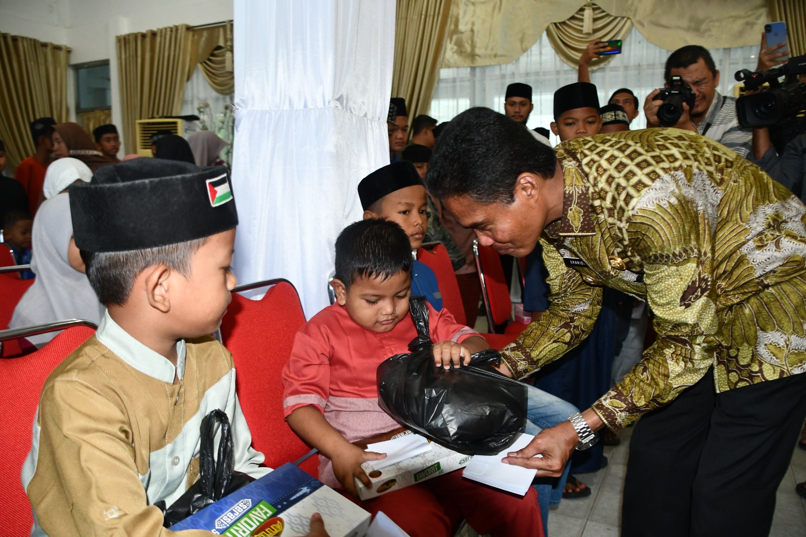 Kota Langsa - Penjabat (Pj) Walikota Langsa Syaridin, S.Pd., M.Pd menyerahkan Santunan kepada Puluhan Anak Yatim di Kota Langsa, kegiatan ini dilaksanakan di Pendopo setempat, Jum'at (14/06/24).